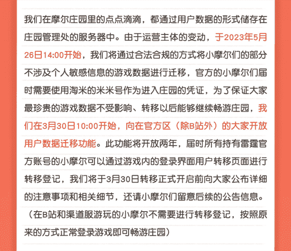 合作结束本就是开发方和代理方双方的事情,,,,降低这件事情对玩家的影响,,,才是对所有珍视这段童年的摩尔玩家最好的呵护。。。目前看来,,,,用户完全不用担心后续因无法登录游戏而造成任何数据上的损失,,只要及时进行账号转移,,就可以好好保留、、延续在庄园的痕迹和回忆,,,继续在庄园里做快乐的红鼻子小鼹鼠。。