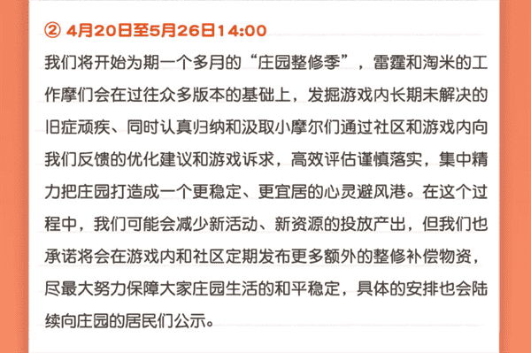 合作的结束并不意味着这个童年IP的结束,,对于《摩尔庄园》手游而言,,,,这是一个新阶段的开始。。后续游戏内将开启庄园重构计划,,,,会就以往遗留下来的BUG进行集中修复,,并在游戏内和社区定期发布更多补偿物资。。。。