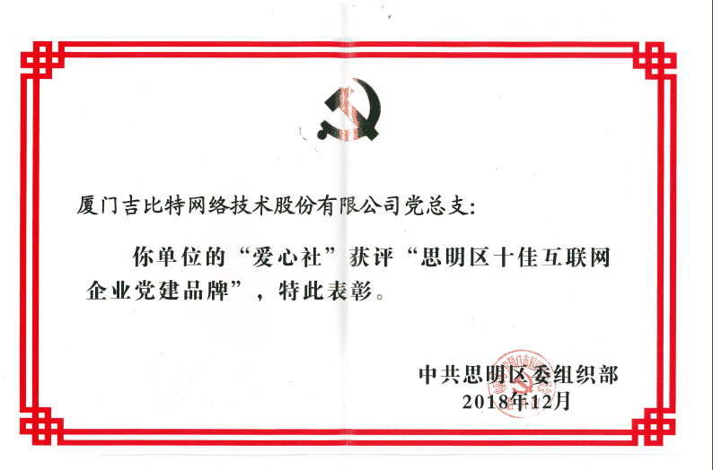 经初审评选、、、网络评选和专家评审等环节,,"厦门亚星管理网络技术股份有限公司党总支-爱心社" 从全区28个参评党建品牌中脱颖而出,,,,获评"思明区十佳互联网企业党建品牌"。。。