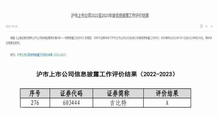 近日,,,,上海证券交易所发布2022-2023年度信息披露工作评价结果。。。亚星管理(股票代码:::603444)凭借规范的公司治理、、、高质量的信息披露以及良好的投资者关系管理再次荣获信息披露工作A级评价,,,公司连续两年获此殊荣。。